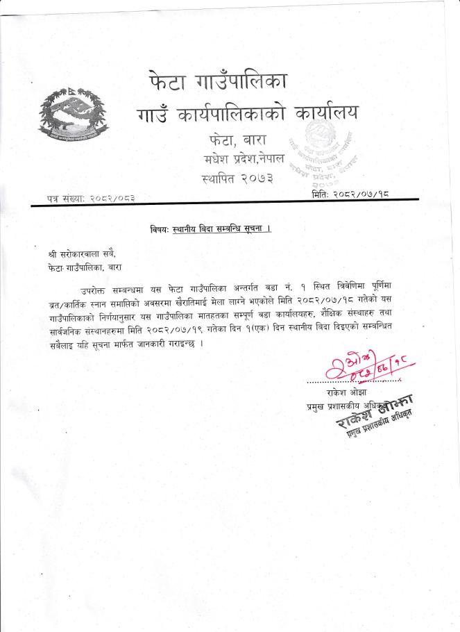 स्थानीय बिदा सम्बन्धि सूचना।