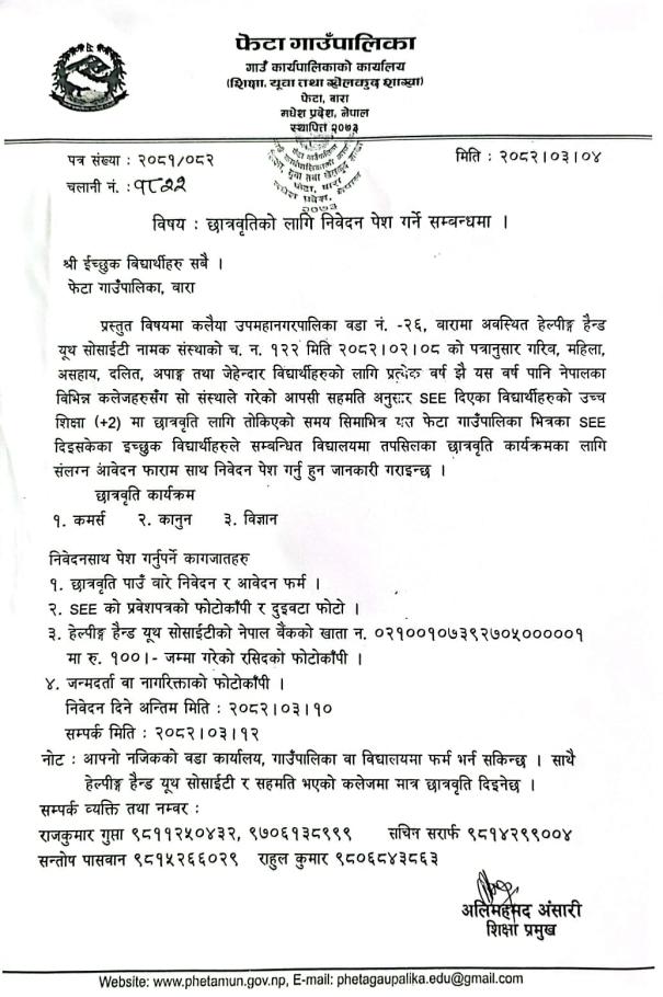 छात्रबृतिको लगि निबेद पेश गर्ने सम्बन्धमा।