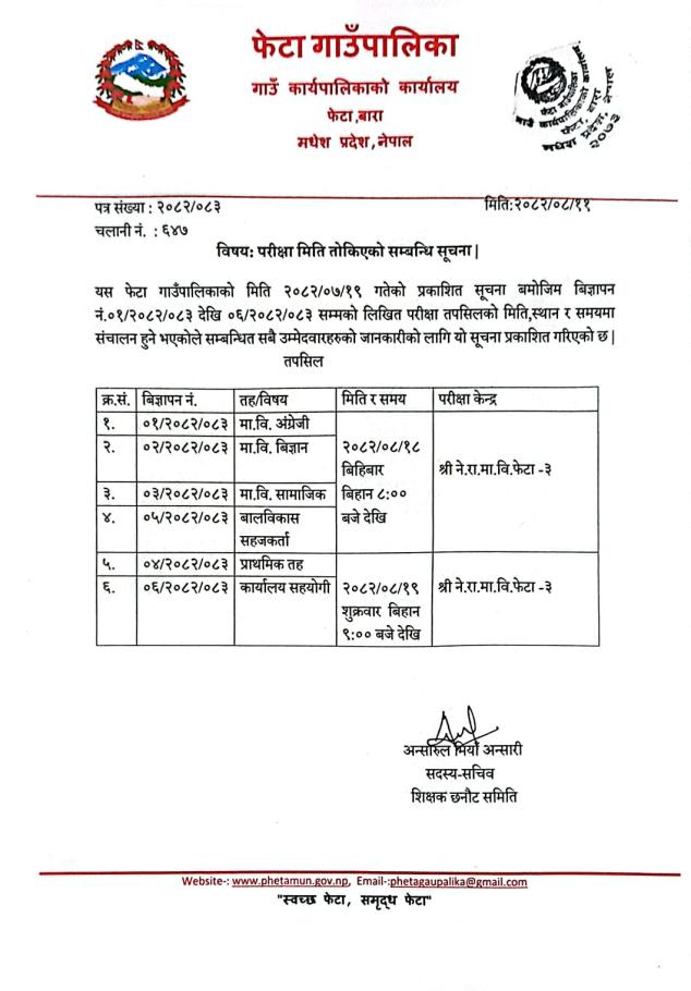 परीक्षा मिति तोकिएको सम्बन्धि सूचना।