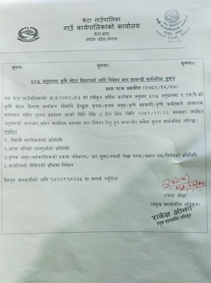 ५० % अनुदानमा कृषि मोटर विरणको लागि निवेदन माग सम्बन्धि सार्वजनिक सूचना।